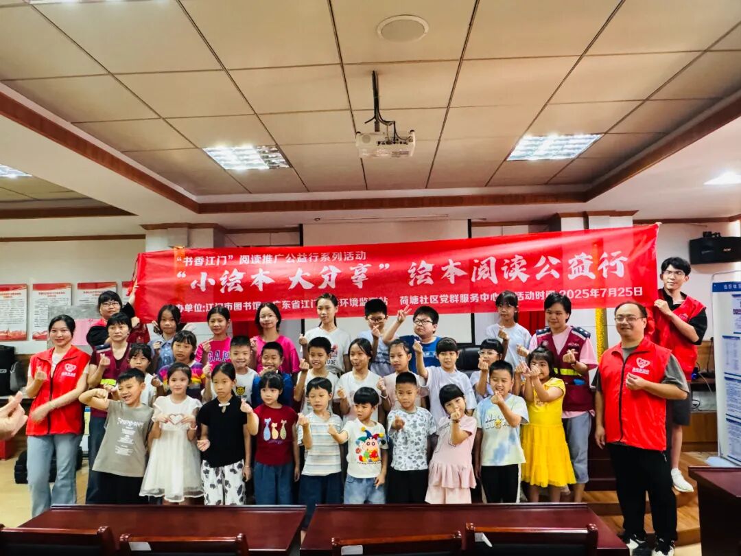 7月25日上午,由江门市图书馆携手广东省江门生态环境监测站、荷塘社区党群服务中心共同开展的 “小绘本 大分享” 绘本阅读公益行活动,在荷塘社区热闹开场。30名小朋友带着好奇与期待齐聚一堂,在生动的绘本故事讲述与趣味互动游戏里,悄悄播下环保的种子,也收获了满溢的知识与快乐。