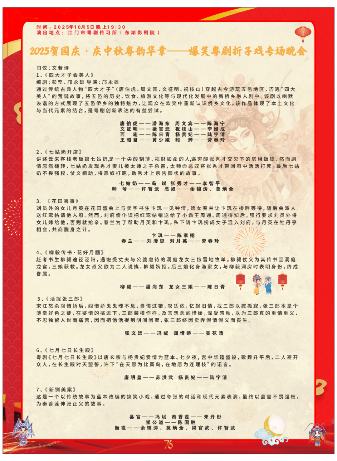 2025年10月5日晚上19:30,本场晚会充满欢乐与惊喜。《四大才子会美人》通过四大才子与四大美人的穿越相遇,以幽默诙谐的方式展现五邑侨乡文化,潘海东、陈海宁等演员将为您带来一场别具一格的视听盛宴。《七姑奶开店》剧情反转,冯斌饰演的七姑奶性格鲜明,与李智平饰演的张秀才共同演绎这段充满戏剧性的故事。还有《花田喜事》等轻松有趣的剧目,让您在欢笑中度过一个愉快的夜晚。