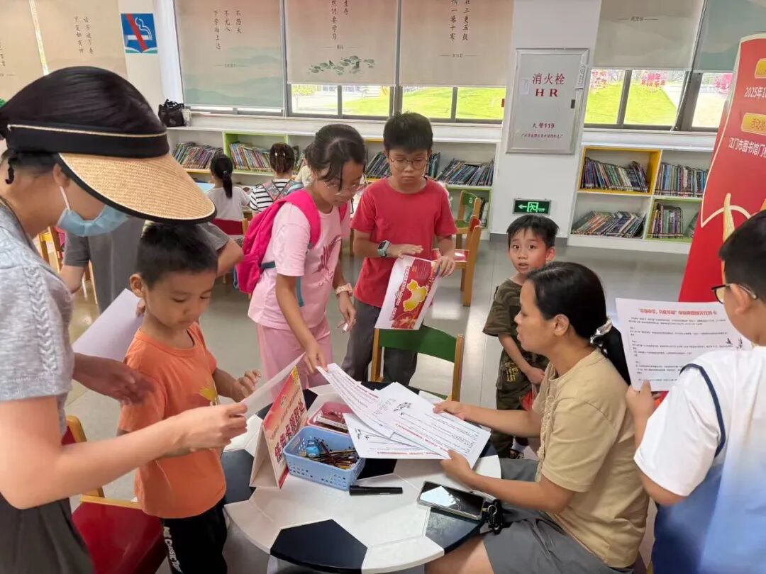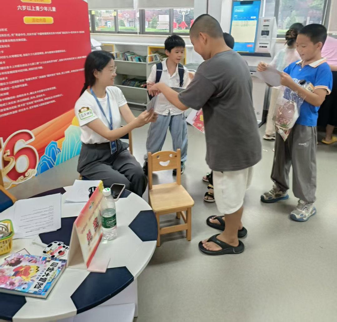 活动期间,江门市图书馆少儿馆洋溢着喜庆氛围,任务卡领取处早早围满了跃跃欲试的小读者。他们领取 “寻迹中华,共庆华诞” 任务卡,根据闯关说明与示意图,寻找所属地理区域、找寻相关图书、搜寻地理指导员,对每个神秘关卡都充满 “闯关” 的期待。