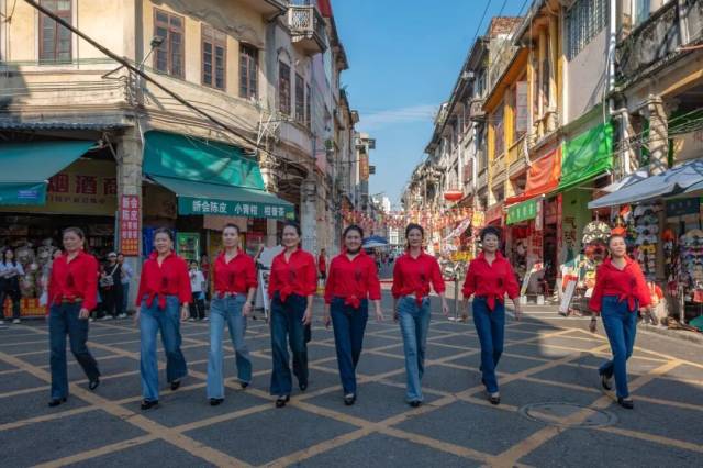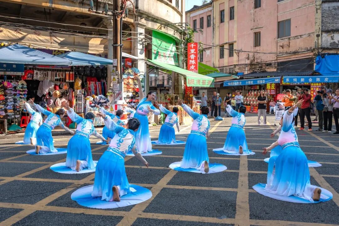 10月25日午后,长堤历史文化街区在秋日暖阳中苏醒。三点三刻,随着阵阵悠扬的旋律响起,江门市文化馆“墟街有戏”舞蹈专场精彩上演,为即将到来的重阳佳节与十五运会营造了喜庆祥和、活力涌动的氛围。