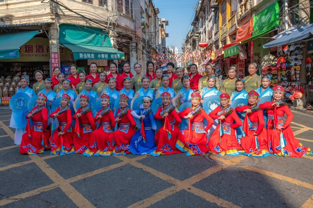 这场由多支江门市文化馆文化志愿者艺术团联袂呈现的视觉盛宴,在百年骑楼下铺展开流动的画卷:《彩云追月》将岭南月色演绎得诗意盎然;《欢腾》以炽热节奏点燃全场,飞扬的裙摆与观众如潮掌声相互激荡;《黄河水从我家门前过》勾勒出跨越山河的家国情怀;《青春靓影》跃动的身影则与老街古朴的底色碰撞交融,奏响了一曲传统与现代激情碰撞的时代交响……