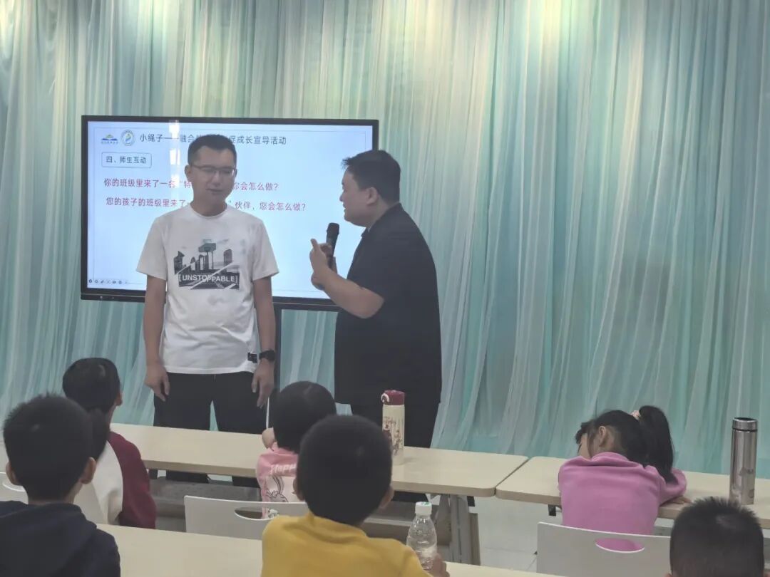 观影结束后,“融合课堂” 互动环节随即开启。杨浩杰老师再次走上台前,带领孩子们回顾影片中的精彩细节。他通过提问的方式,引导孩子们思考影片中主人公的行为背后所蕴含的意义,比如 “为什么他们会用小绳子连接彼此?”“在生活中,我们应该如何对待和我们不一样的小伙伴?” 孩子们积极举手发言,分享着自己的观影感受和想法,稚嫩的话语中却充满了对友谊和包容的理解。杨老师耐心倾听每一个孩子的回答,并适时进行引导和总结,让孩子们在轻松愉快的氛围中,进一步加深了对融合教育理念的认知。
