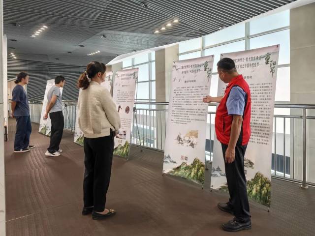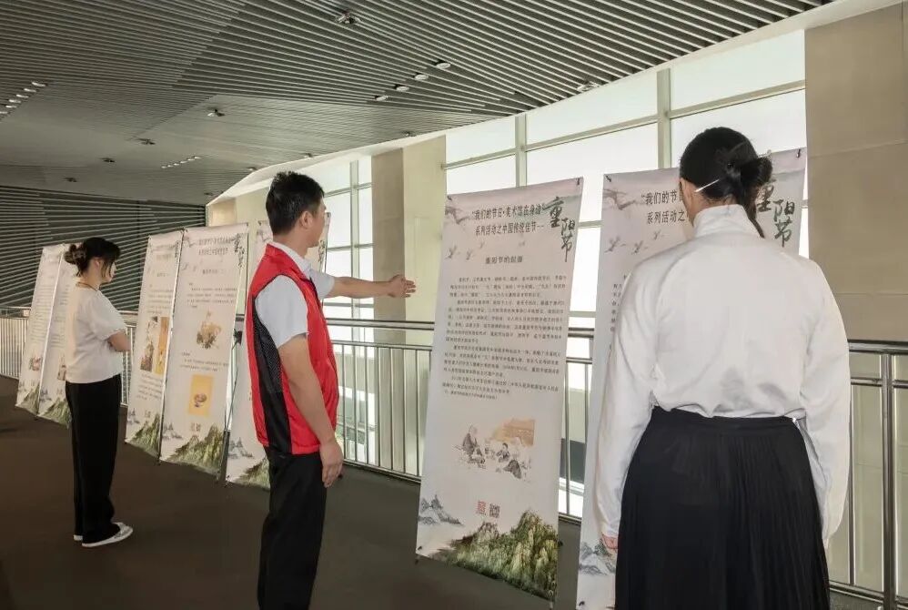 本次活动在美术馆二楼公教展示区设置了“重阳节主题艺术展架”,以静态展览的形式为市民呈现了一场富有文化内涵的视觉体验。展架内容围绕重阳节的文化传统与敬老爱亲主题,通过艺术作品与文字解读相结合的方式,生动展现了重阳节的历史习俗及其当代价值。