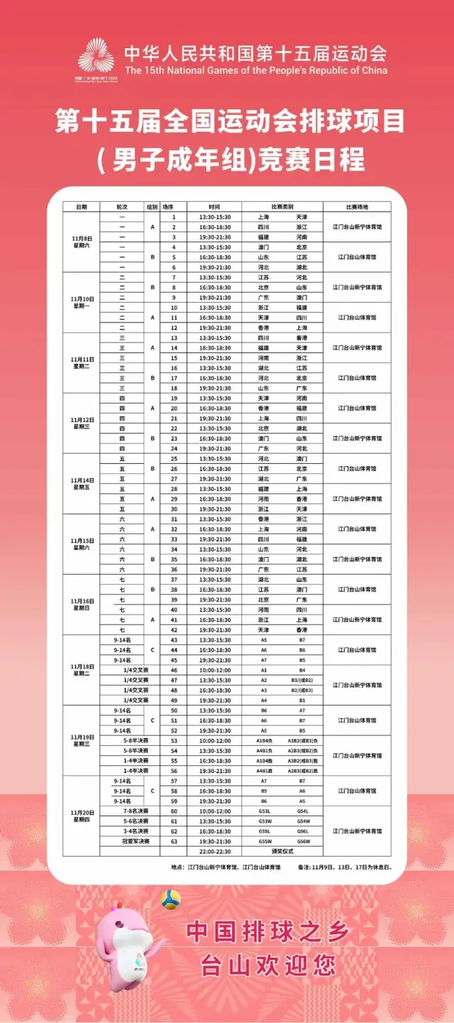 根据赛程安排,排球(男子成年组)比赛从11月8日持续至11月20日。在接下来的13天里,14支劲旅共168运动健儿,将在台山新宁体育馆和台山体育馆展开激烈角逐。
