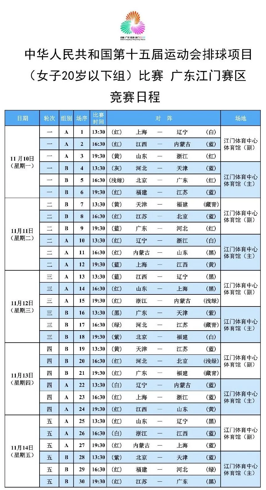 11月10日,第十五届全国运动会排球(20岁以下组)比赛在广东江门体育中心正式拉开战幕