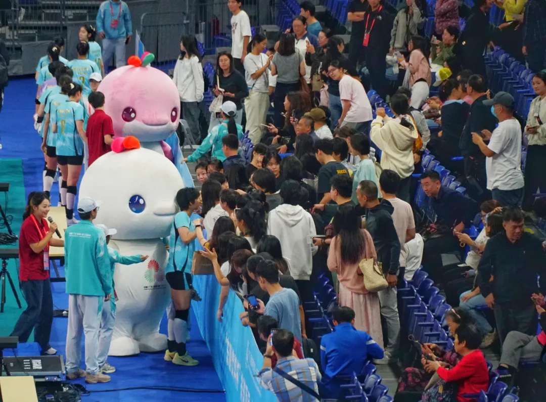 赛场上,十五运吉祥物喜羊羊和乐融融萌宠可爱,受到队员和观众的一致喜爱,争相合影打卡