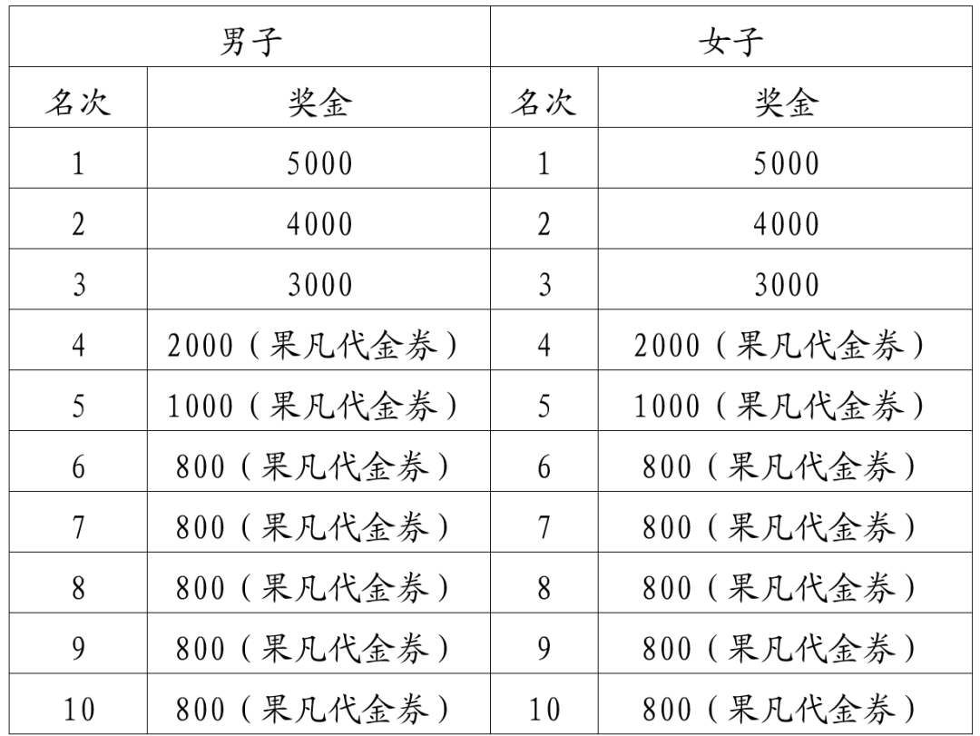 (二)半程马拉松男、女(净计时)前十名将获得以下奖励(单位:人民币)