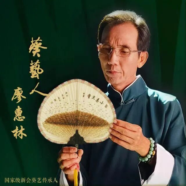 廖惠林坚守新会葵艺传承40余年,深耕葵扇编织、烙画等技艺,其作品多次获国家级和省级金奖,并被中国工艺美术馆收藏,曾参加法国巴黎工艺博览会、上海世博会等展演活动。其创办的江门市新会区会城葵乡传统工艺品经营中心已成为省级非遗传承基地。