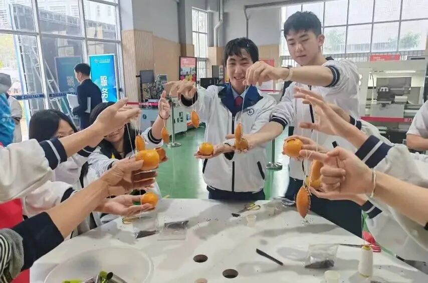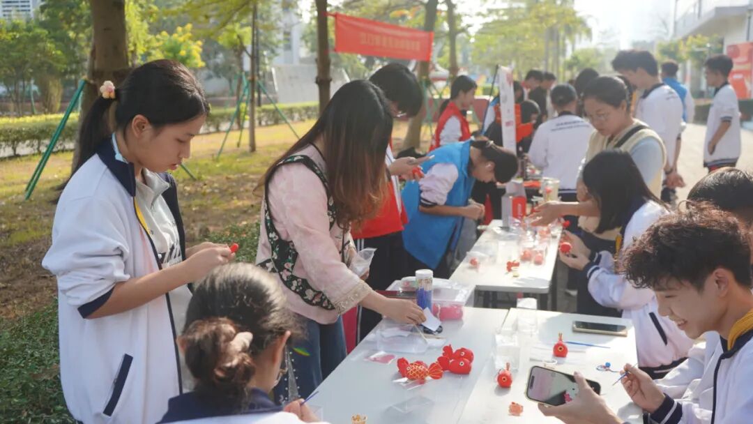 江门市文化馆、江门市非物质文化遗产保护中心精心打造的非遗互动体验市集同步开市,集中展示了新会葵艺、罗氏柑普茶制作技艺、外海生恭鲤鱼手工艺品等12个本地特色非遗项目。传承人近距离面对面展示精湛技法,手把手教学生们动手实操,在指尖互动中感受传统工艺的匠心魅力。市集还设置文创展示区,将非遗元素与现代设计相结合的特色产品,让学生直观感受非遗在新时代的生命力。