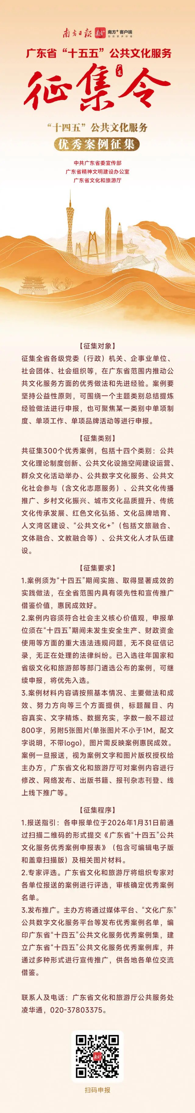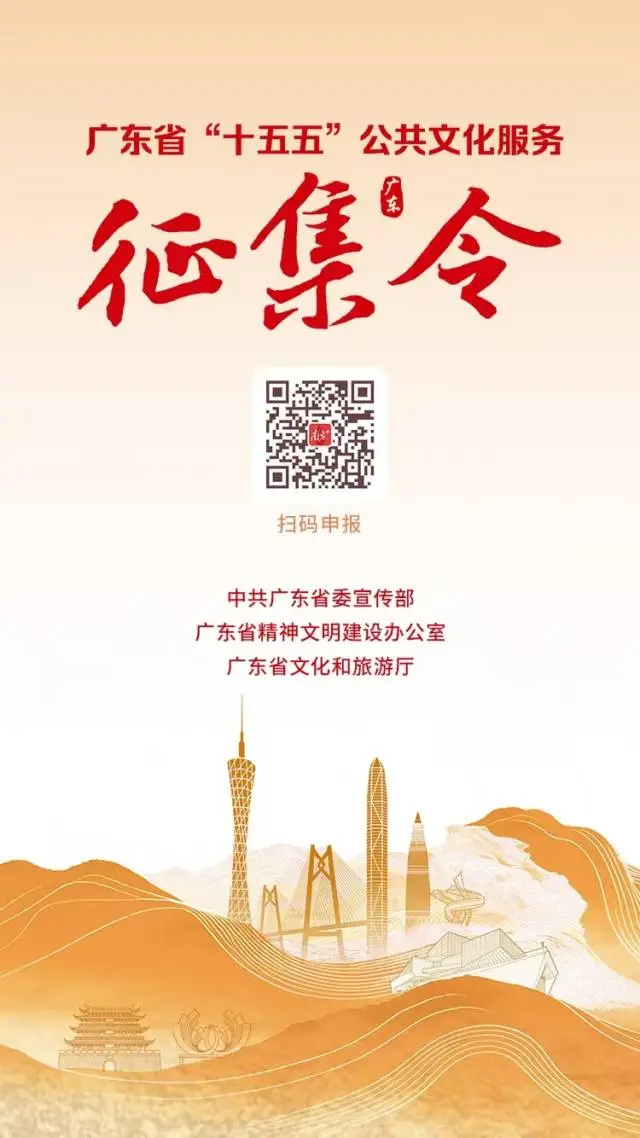 12月31日,中共广东省委宣传部、广东省精神文明建设办公室、广东省文化和旅游厅向全社会正式发布一项重要活动:广东省“十五五”公共文化服务“征集令”,将于2026年1月1日起,全面启动“十四五”公共文化服务优秀案例征集与“十五五”公共文化服务优质主体征集活动。