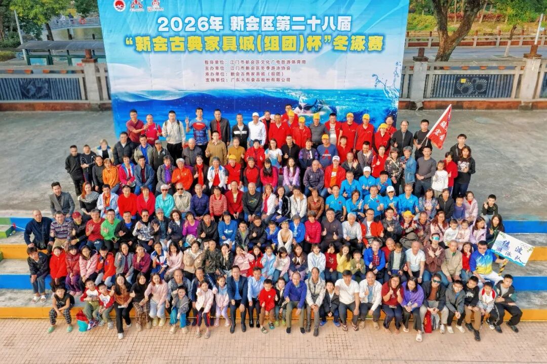 1月1日下午,2026年新会区第二十八届“新会古典家具城(组团)杯”冬泳赛在新会人民游泳池顺利开赛。300余名游泳爱好者同台竞逐,以蓬勃向上的运动激情开启新年第一天。