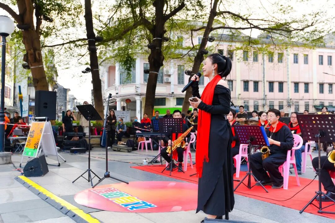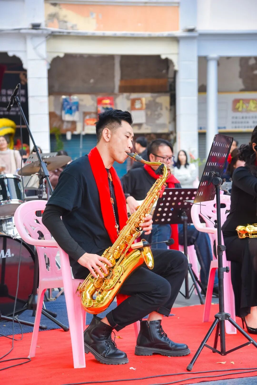 冬日暖阳照耀着骑楼古街,空气中弥漫着节日的欢乐,广场的喧嚣与悠扬的音符交织成一幅动人的画卷。