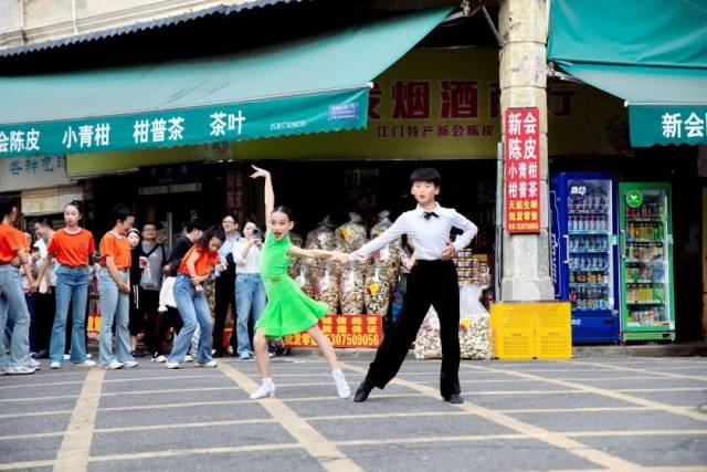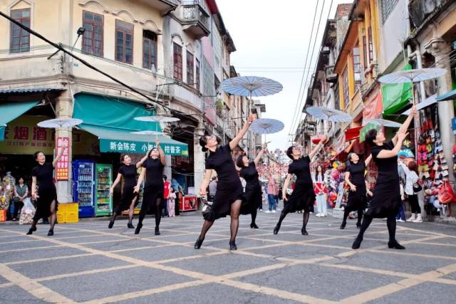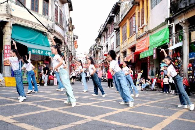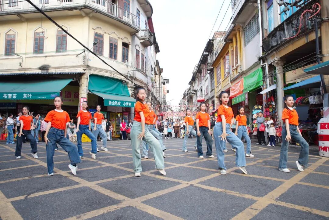 此次快闪以多元的舞蹈形式呈现侨乡舞者风采:集体舞《大家一起来》的明快节奏迅速点燃全场,吸引大批观众驻足;成人集体舞《亲爱的你》以优美肢体语言演绎温情,少年双人舞《快乐恰恰》以鲜明的节奏与轻快步法展现出蓬勃朝气,集体舞《潇洒走一回》则以洒脱流畅的编排惊艳全场。除了定点演出,舞队还以行进式舞动与沿途观众密切互动,吸引众多行人自发跟随、拍照,形成古街上一道流动的亮丽风景线。
