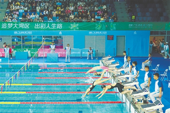记者在现场看到,随着裁判一声令下,运动员们起跳入水,奋力向终点游去。有的运动员虽然由于身体原因游得比较慢,但并没有中途放弃,而是一直坚持游到终点,充分展示出运动员突破极限、挑战自我的体育精神。广东二队领队潘湘俐表示:“今天是开赛首日,队员们发挥比较稳定。在江门主场作战,听着熟悉的乡音,感受着现场融洽的氛围和观众的热情,我们倍感亲切。希望年轻队员能充分感受赛事气氛,并争取优异成绩。”