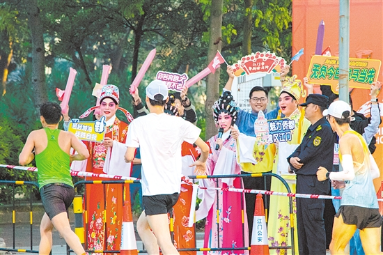 今年江马的跑道,被跑者们誉为一条“会唱歌、有故事”的风景线。组委会精心打造的“音乐赛道”,将27个氛围点化作27个流动的舞台。在体育路保利公寓转华盛路氛围点,江门市粤剧传习所的演员们一曲曲经典粤曲,婉转唱腔吸引不少选手放慢脚步拍照记录,吸引观众驻足聆听、沉醉其中。其中,大家耳熟能详的红线女《荔枝颂》最为动人。今年恰逢红线女100周年诞辰,那穿越时空的“红腔”在赛道上空缭绕回荡,以独特的艺术魅力连接起经典记忆与当下激情。