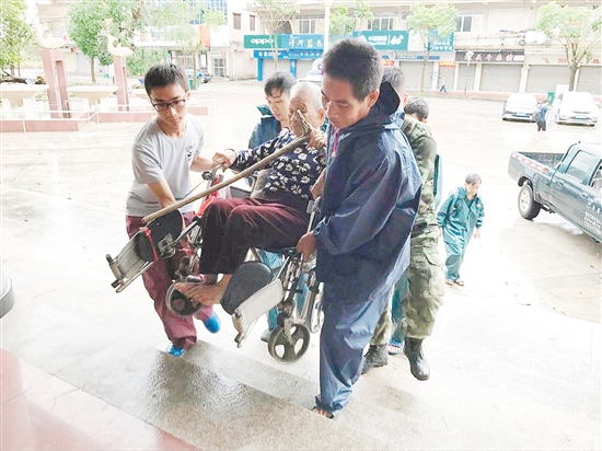转移过程中,遇到台山市蓝田稔平村村民李彩晃,年龄86岁,独居,无子无女。村委会干部于8月22日晚已经开始入户通知老人到村文化楼或者村委会安置,但老人执意不肯,闭门不见。8月23日一早,村干部李聪悦等再次到老人家里,仍然吃到闭门羹,但他们仍然坚持隔窗劝说,老人虽然打开门了,但仍然不愿转移。当时雨势已经非常大,屋内已见漏雨情况,老人不停清理屋内进水。考虑到老人岁数已大,而且固执倔强,无法劝离。眼看风大雨大,危情随时可能发生,村干部在请示了镇领导意见后,在派出所民警的协助下,由村干部与民警共同将老人搀扶出危房。