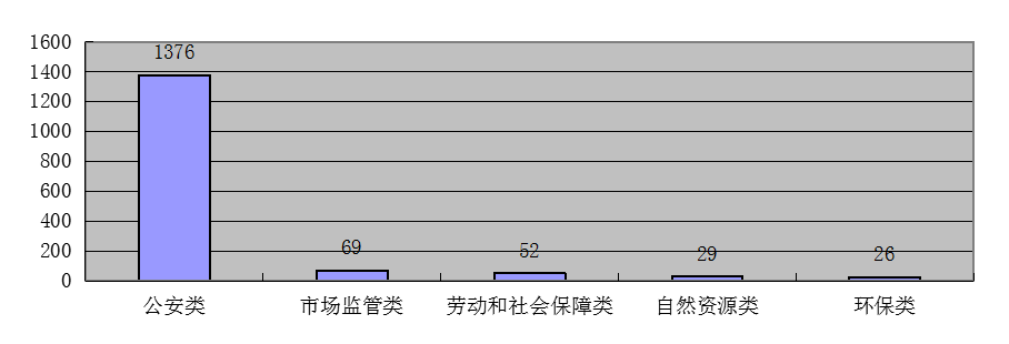 2019年立案受理的行政复议1647宗案件中,公安类1376宗(主要由公安交警部门实施智能交通管理引起),占立案受理总量的83.55%;市场监管类69宗,占4.19%;劳动和社会保障类52宗,占3.16%;自然资源类(包括土地、林业、城乡规划和不动产登记)29宗,占1.76%;生态环境类26宗,占1.58%。上述涉及的公安、劳动和社会保障、市场监管及生态环境均与老百姓利益息息相关。