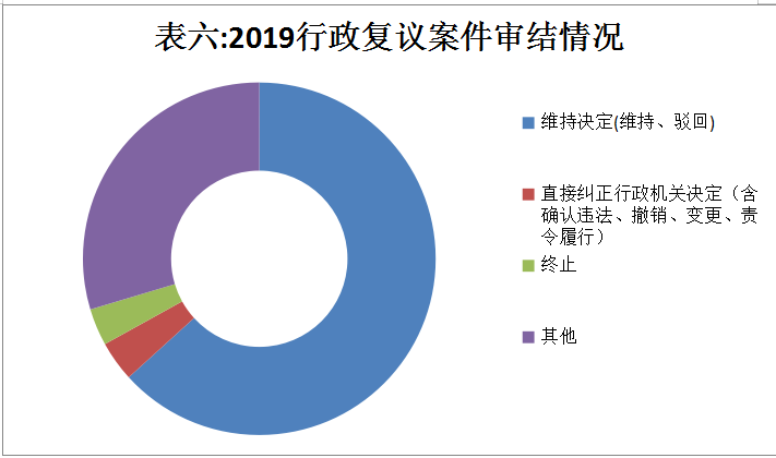 2019年,全市各级行政复议机关共审结行政复议案件1386宗,审结率为84.15%。其中,维持行政机关决定(含驳回、维持)877宗,占63.28%;直接纠正行政机关决定(含确认违法、撤销、变更、责令履行)51宗,占3.68%;终止结案47宗,占3.39%;其他方式结案411宗,占29.65%。(详见表六)。